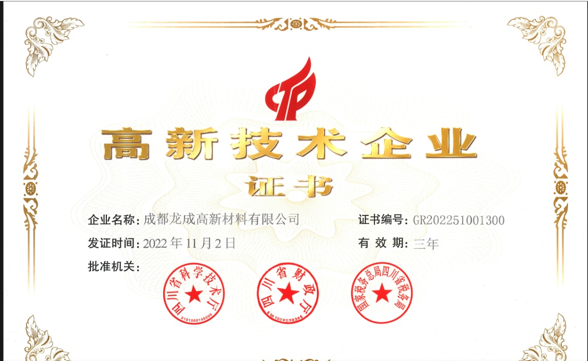 成都龙成高新材料有限公司四川省“专精特新”中小企业证书